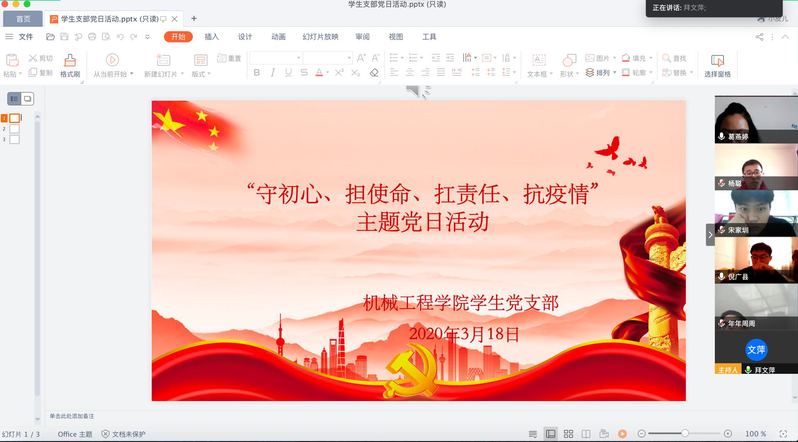 318日下午,机械工程学院学生党支部在线开展了“守初心、担使命、扛责任、抗疫情”线上主题党日活动。