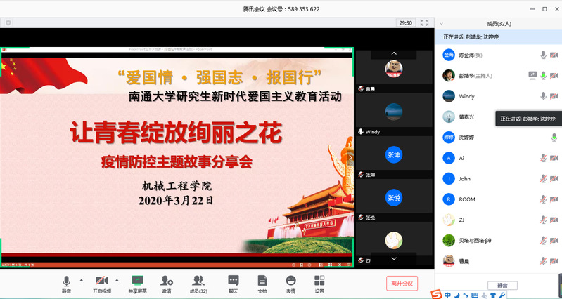 322日下午,机械工程学院研会与18机械研究生团支部联合开展团日活动,在线举行研究生爱国主义主题教育活动——“让青春绽放绚丽之花疫情防控主题故事分享会。全体18级和1719级研究生代表参加活动。