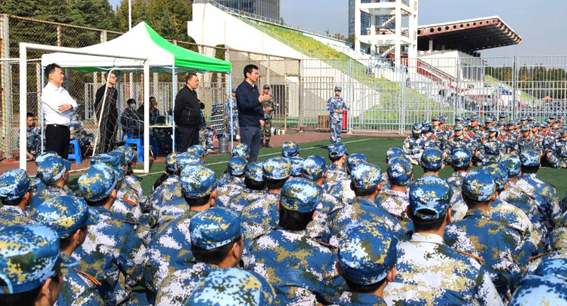 院领导查看了学生的训练情况,并向教官、值班老师表示慰问和感谢。张志刚代表学院对所有参训学生的表示慰问。张志刚将先校长张謇先生“国家思想、实业知识、武备精神”的人才培养目标与当今国际国内局势相结合,进一步阐明了军训的意义,激发学生爱党、爱国、爱社会主义的热情。朱昱分享了自己在军队院校学习生活的经历和体会,鼓励同学们发扬严守纪律、吃苦耐劳的精神,展现严谨认真的训练作风和积极向上的精神面貌,高标准、严要求完成军训任务。