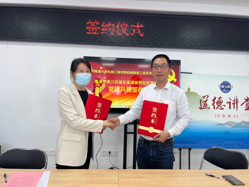 4月25日下午,机械工程学院机械制造工程系党支部与崇川区城东街道板桥社区党委联合开展主题党日活动,双方签署了《党建合作共建协议》。